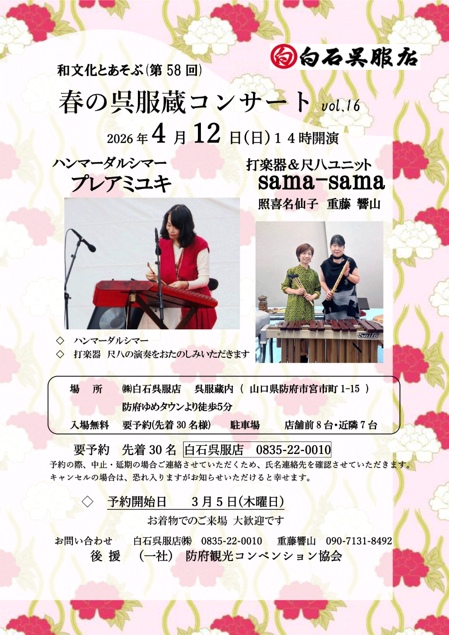 | 場所 | 株式会社白石呉服店 呉服蔵内 山口県防府市宮市町1-15 防府ゆめタウンより徒歩5分 |